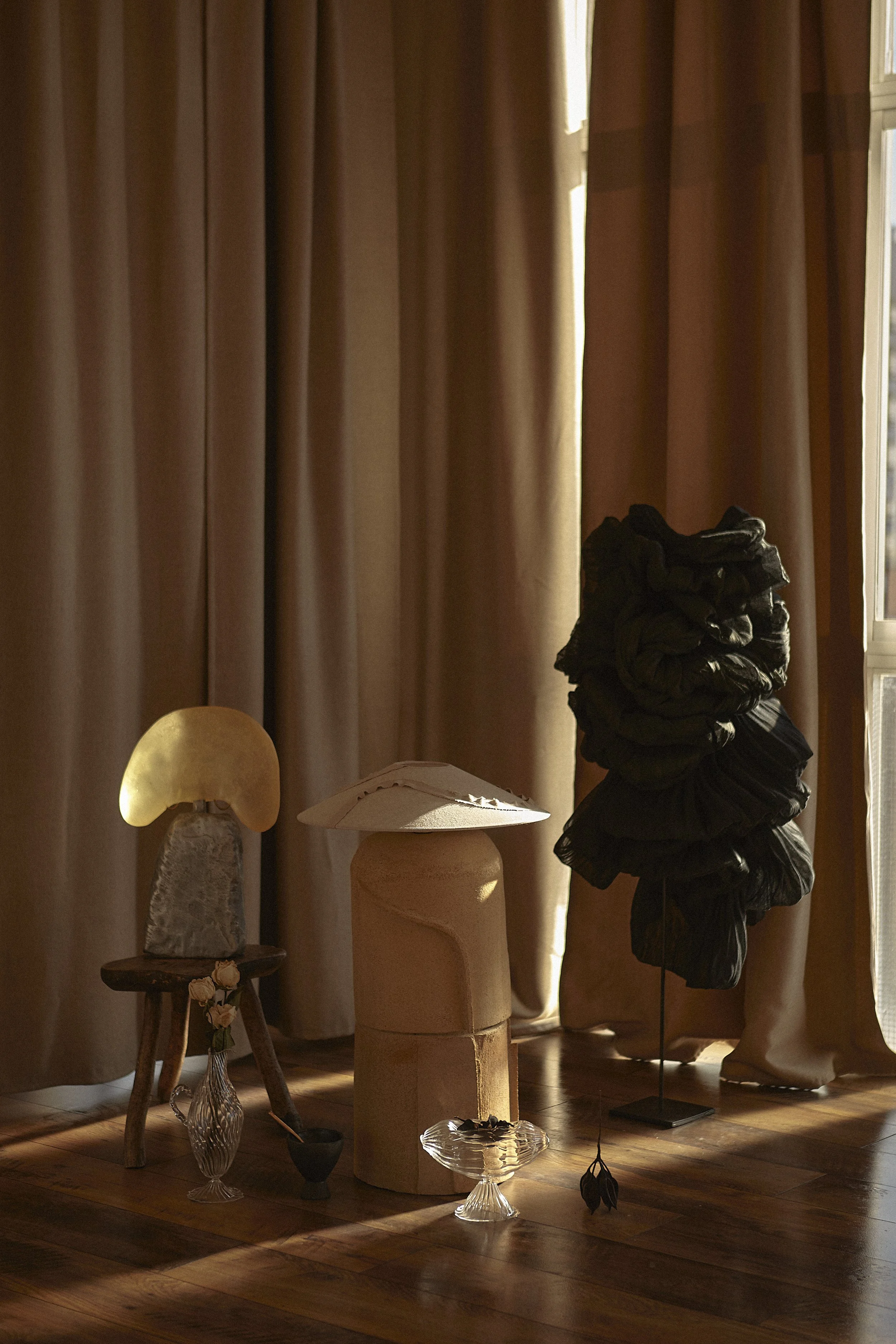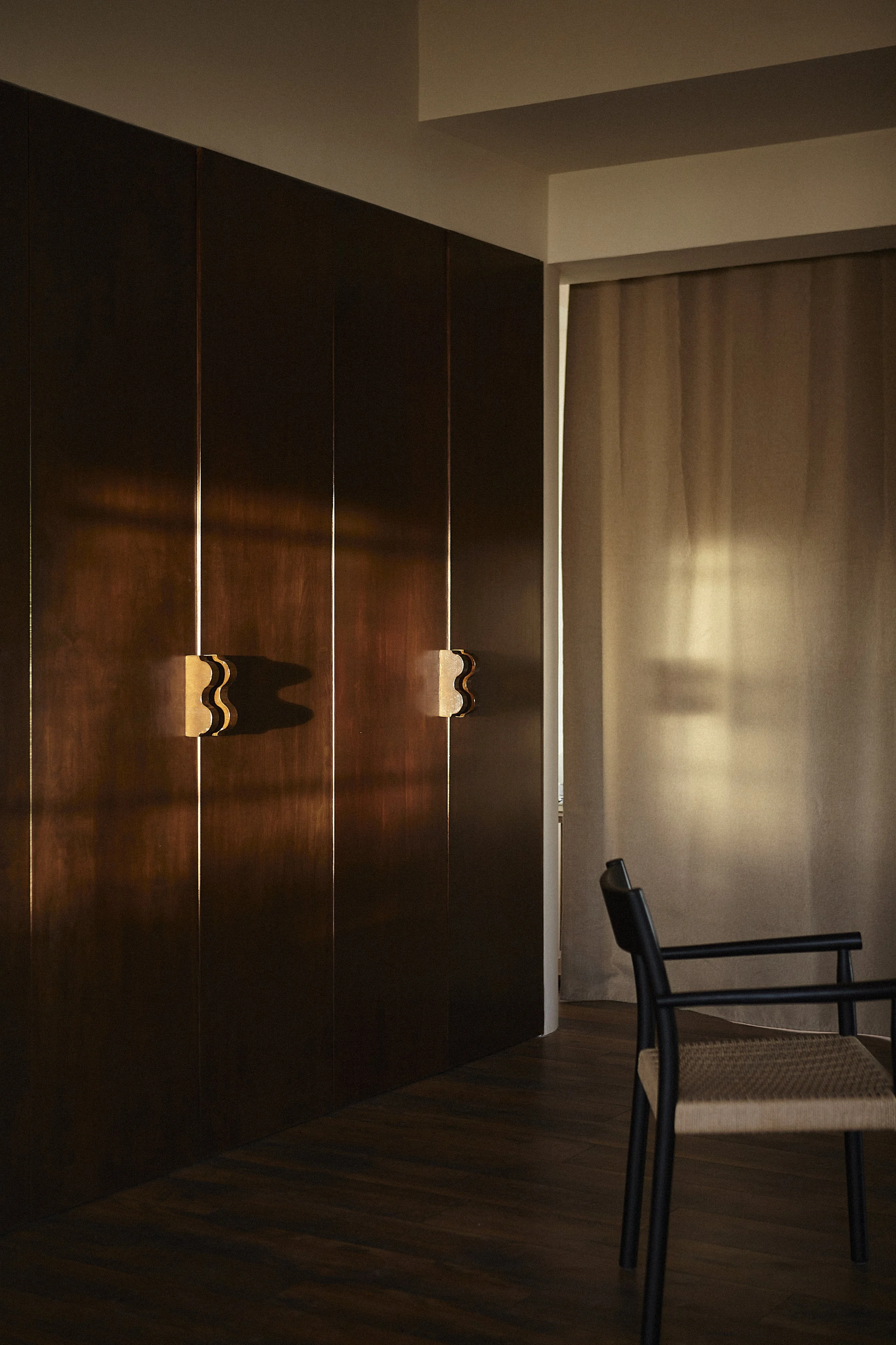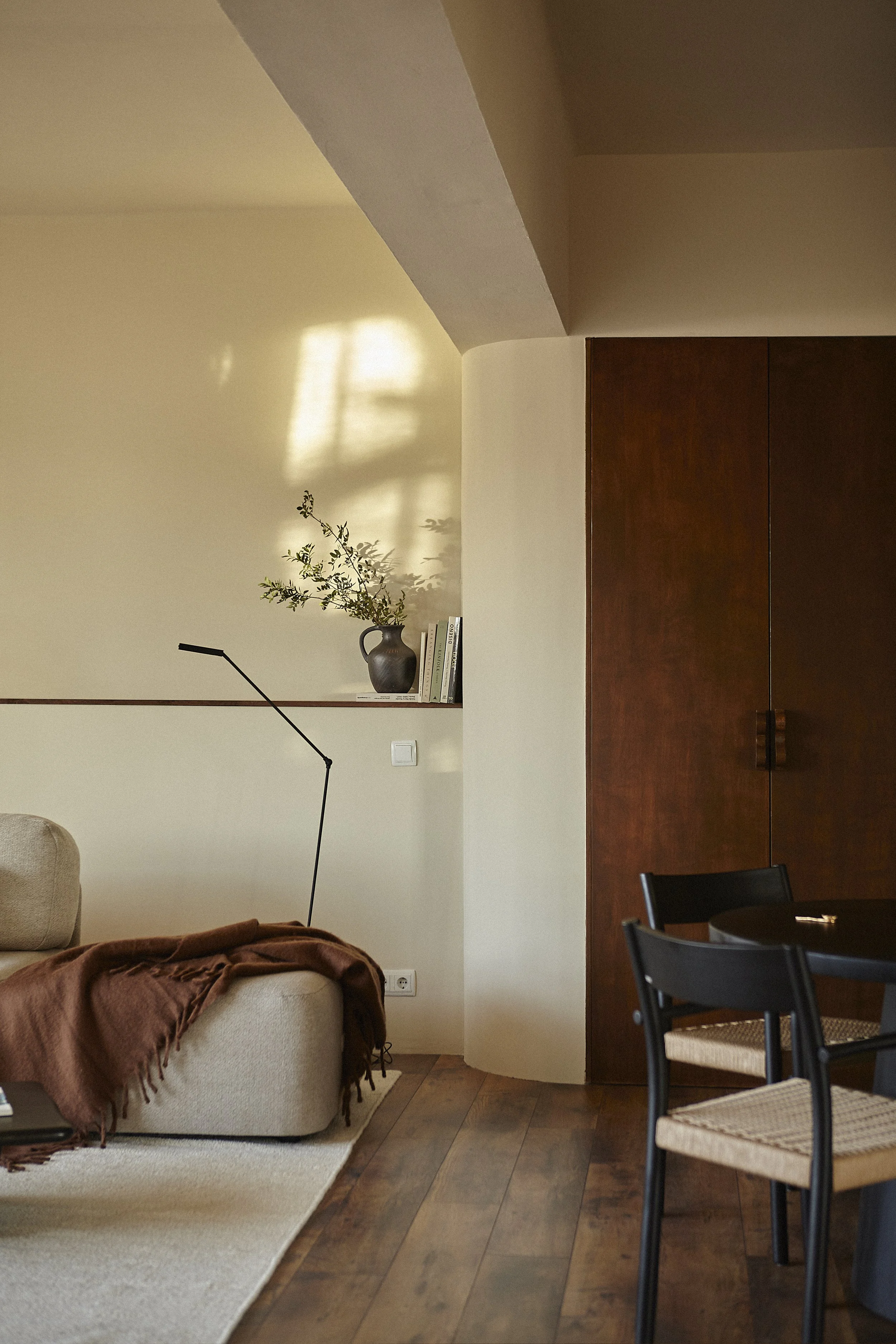 This project blends ephemeral architecture, set design, and a homely touch, bringing together the warmth of l’Empordà and the character of Barcelona. At its center, a curved-wall wardrobe with custom handles by Puerto Rican designer Edgardo Cuevas, alongside textiles that showcase our design expertise, define the 150m² space.